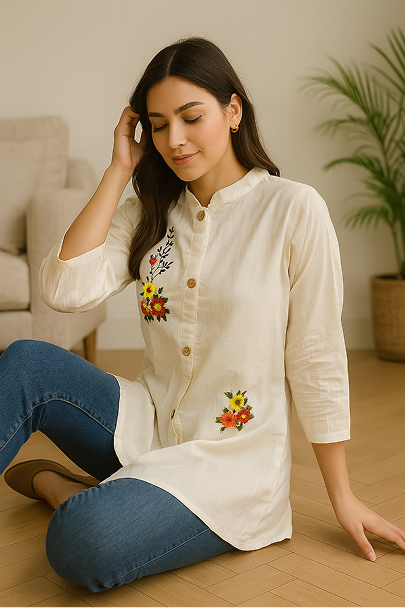 Khadi short kurti embroidery work midium length sleeves flawor